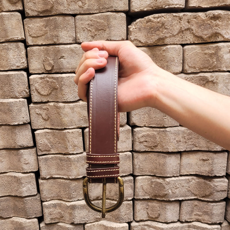 | Cinturón artesanal de cuero bayo, con diseño de espiga bordado alusivo a la cultura chilena. Puedes encontrar el tuyo desde las tallas 90 al 120. |